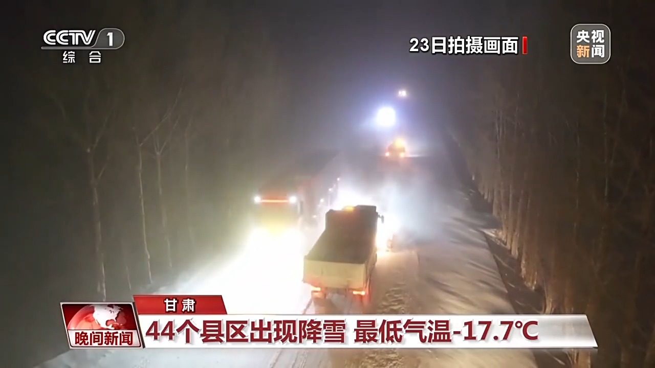从11月23日起,受较强冷空气影响,甘肃自西向东出现大风、降温和雨雪天气。据监测,23日8点至24日8点,甘肃省44个县区出现降雪,全省大部最低气温已降至-6℃以下,张掖民乐出现全省最低气温-17.7℃。受地面积雪和结冰影响,多条高速及国、省干道局部路段实施临时交通管制。