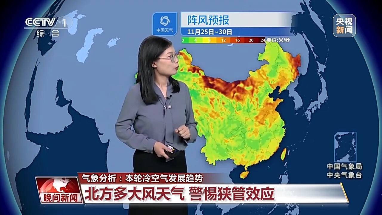 气象分析师 孙倩倩:本周冷空气频繁,会导致各地气温多波动起伏,同时天气干燥多风。眼下这轮冷空气24日重点影响的是北方,尤其是在偏北的地区降温是比较猛烈的。同时从内蒙古中部到河南山东一带还伴随着6级以上的大风,局部地区阵风达到了10~11级。
